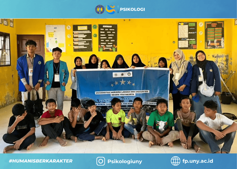 Aceh Tamiang – Students from the Faculty of Psychology at Universitas Negeri Yogyakarta (UNY) participating in the Aceh Humanitarian Community Service Program (KKN Kemanusiaan Aceh) conducted psychosocial assistance activities for children affected by flooding in Kebun Tanah Terban, Karangbaru District, Aceh Tamiang Regency. The program, which took place from January 10 to February 10, 2026, was part of a collaborative initiative between UNY and Universitas Samudra (UNSAM) aimed at supporting community recovery after the disaster.
